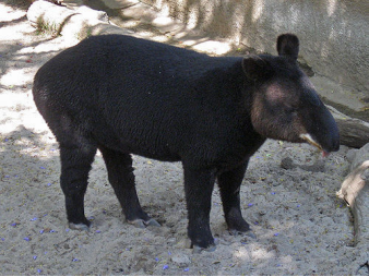 山貘(学名:Tapirus pinchaque):身上生有一层卷毛,有时又被称为毛貘。体长约1.8米;肩高0.75-0.80米;重量150千克。 山貘身体大部分长有棕色至黑色的长毛,唇部四周为白色。成年山貘臀部有两块无毛区域。皮肤厚韧,毛被稀少;鼻端向前突生,能自由伸缩;耳中等大小,卵圆形;尾极短;有1对乳头。四肢很像犀牛,但是比犀牛细而短。前脚四趾,后肢三趾。