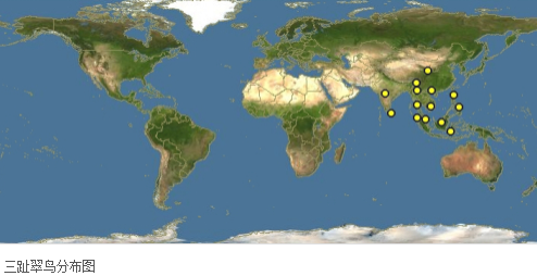 | 1. | 三趾翠鸟指名亚种 | Ceyx erithacaerithaca | 印度西南孟买、斯里兰卡、不丹、中国(云南,海南)、苏门答腊和邻近岛屿。 |