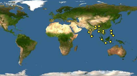 分布范围:分布于孟加拉国、不丹、柬埔寨、中国、印度、印度尼西亚、老挝人民民主共和国、缅甸、尼泊尔、菲律宾、斯里兰卡、泰国、越南。