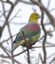 外形特征:中等体型(33厘米)的绿鸠。雄鸟:头绿,头顶橙黄,胸橙黄,上背紫灰;翼覆羽及上背紫栗色,其余翼羽及尾深绿色且大覆羽及色深的飞羽羽缘黄色;臀淡黄具深色纵纹;两胁边缘黄色;尾下覆羽棕黄。雌鸟:尾下覆羽及臀浅黄具大块的深色斑纹;无雄鸟的金色及栗色。