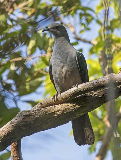 生活习性:常单个或成对活动,冬天也成群活动。常在树冠层活动,特别是早晨和黄昏,常栖于大树顶端的枯枝上,一般很少下地,通常仅在需要啄食泥上和沙粒时才下地。飞行快速而有力,多在高空中,但拍翼并不频繁。叫声为“咕,咕,咕,……”,比较深沉,即使在附近鸣叫,听起来也好象是从远处传来的声音,终止前的一声比较延长,声音也很特别,很象是人类窃笑的声音。
