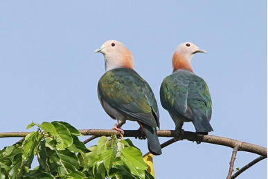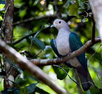生活习性:绿皇鸠常单个或成对活动,冬天也成群活动。常在树冠层活动,特别是早晨和黄昏,常栖于大树顶端的枯枝上,一般很少下地,通常仅在需要啄食泥上和沙粒时才下地。飞行快速而有力,多在高空中,但拍翼并不频繁。叫声为“咕,咕,咕,……”,比较深沉,即使在附近鸣叫,听起来也好像是从远处传来的声音,终止前的一声比较延长,声音也很特别,很象是人类窃笑的声音。
