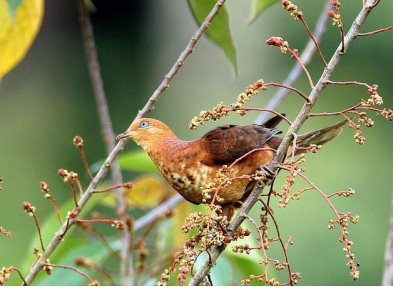 物种概述:小鹃鸠松巴亚种(学名:Macropygia ruficeps orientalis(Hartert, 1896))是小鹃鸠的亚种之一,体长32厘米。头顶和头侧为棕栗色,背上部及两肩呈棕色,并缀有黑褐色的细横斑纹。嘴爪平直或稍弯曲,嘴基部柔软,被以蜡膜,嘴端膨大而具角质;颈和脚均较短,胫全被羽。栖息于多树或多岩石的山区和农村。在岩缝、峭壁或树木枝条上营巢。常成群活动。生活于海拔600米以上的山林间。有时也出现于林缘和山脚平原,在森林中栖息觅食,食物多是杂草种子、农作物种子和各类植物果实。也常常群起掠食附近稻田。繁殖期为4一7月。常成对营巢繁殖。通常营巢于林中树上枝杈间或灌丛与竹丛间。巢主要由细枝和苔藓等构成。每窝通常产卵1枚。