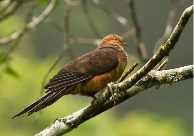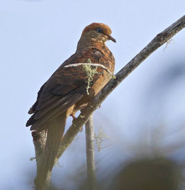 外形特征:是小鹃鸠的亚种之一,体长32厘米。头顶和头侧为棕栗色,背上部及两肩呈棕色,并缀有黑褐色的细横斑纹。嘴爪平直或稍弯曲,嘴基部柔软,被以蜡膜,嘴端膨大而具角质;颈和脚均较短,胫全被羽。
