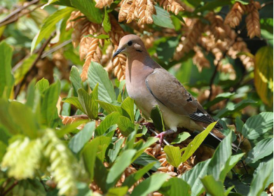 外形特征:鸣哀鸽塞奈达亚种是鸣哀鸽的亚种之一,体长28 ~30厘米,体重雄鸟149~180克,雌鸟120 - 145克。它们的外观很像哀鸽,但体型较为瘦小,尾巴较短及圆,颜色也较深。鸣哀鸽的双翼上有一些白边。全身羽毛一般是红灰棕色,翅膀下部颜色较浅并有大块白色,头和胸腹部为桂皮红色。颈部侧面有虹彩紫色斑块,脸侧有两条暗紫色蓝色条纹,翅膀上有黑色斑点,尾巴圆润,外层尾羽为白色,与内层的黑色羽毛对比强烈。眼睛为黑色,周围皮肤较薄。雌性成鸟在体态上与雄性差别不大,但总体上羽毛要比雄性暗。极少数雄鸟的肩部以上和颈部存在彩色羽毛斑块。幼雏的羽色较暗。该亚种的羽毛整体较暗,尾羽是蓝灰色而不是白色。