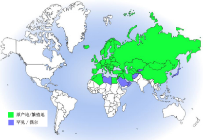 原产地:阿尔巴尼亚、阿尔及利亚、安道尔、亚美尼亚、奥地利、阿塞拜疆、白俄罗斯、比利时、波斯尼亚和黑塞哥维那、保加利亚、中国、克罗地亚、塞浦路斯、捷克共和国、丹麦、埃及、爱沙尼亚、芬兰、法国、格鲁吉亚、德国、希腊、匈牙利、伊朗伊斯兰共和国、伊拉克、爱尔兰、以色列、意大利、约旦、哈萨克斯坦、拉脱维亚、列支敦士登、立陶宛、卢森堡、马其顿共和国、马耳他、摩尔多瓦、黑山、摩洛哥、荷兰、挪威、巴勒斯坦、波兰、葡萄牙、罗马尼亚、俄罗斯联邦、塞尔维亚、斯洛伐克、斯洛文尼亚、西班牙、瑞典、瑞士、阿拉伯叙利亚共和国、塔吉克斯坦、土耳其、土库曼斯坦、乌克兰、英国、乌兹别克斯坦。