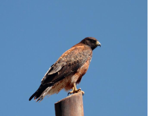红背鵟雕(学名:Geranoaetus polyosoma):体长56厘米,翼展110-120厘米,体重950克。属大型鹰类,翅膀和腿比较长,尾巴中等,它们的外形轮廓非常类似于鵟亚科的其他成员。这个物种是多态形的,它们的羽毛至少呈现2种色态。通常羽毛鲜艳的种群占主导地位,而羽色深暗的则相对较少。背部的红色羽毛与性别有关。因此雄性和雌性通常但不总是二态性的。雄性一般着灰色羽毛,而雌性通常则是红色羽毛。在所有的生长阶段,成鸟都有一个白色的尾巴,有一道宽阔的黑色边缘终点带。在换羽之前,亚成鸟与成鸟非常不同。