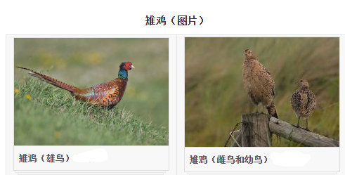 雉鸡(学名:Phasianus colchicus):是鸟纲雉科的一种走禽,共有30个亚种。体形较家鸡略小,但尾巴却长得多。雄鸟和雌鸟羽色不同,雄鸟羽色华丽,多具金属反光,头顶两侧各具有一束能耸立起而羽端呈方形的耳羽簇,下背和腰的羽毛边缘披散如发状;翅稍短圆;尾羽18枚,尾长而逐渐变尖,中央尾羽比外侧尾羽长得多,雄鸟尾羽羽缘分离如发状;雄鸟跗跖上有短而锐利的距,为格斗攻击的武器,近年来还发现距的长度与其所拥有的配偶数量明显相关,是雌鸟选择配偶的一个重要标准。