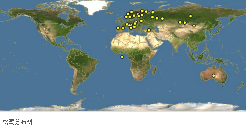 松鸡在世界上的分布范围很大,从欧洲北部的斯堪的纳维亚半岛,向南到阿尔卑斯山和巴尔干半岛;向东到西西伯利亚、中亚、蒙古西北部和中国新疆北部的阿尔泰山,随着地理环境的不同,共分化有12个亚种,其中分布于中国的是阿尔泰亚种,仅分布于新疆阿勒泰、富蕴、布尔津、福海和哈巴河等县境内。