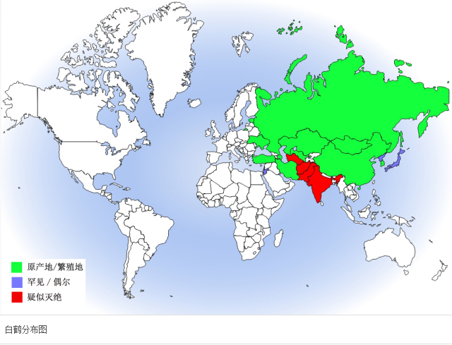 白鹤在中国主要分布在从东北到长江中下游,迁徙时见于河北(滦河口、北戴河),内蒙古(赤峰、达赉湖、兴安盟、哲里木盟),辽宁(双台河口、大连),吉林(莫莫格、向海),黑龙江(扎龙、林甸),安徽(武昌湖、升金湖、莱子湖),山东(黄河三角洲),河南(黄河故道、黑港口)等,越冬地主要在江西(鄱阳湖)和湖南(洞庭湖),越冬期间零星个体见于辽宁瓦房店、江苏盐城和东台、浙江余姚、山东青岛沿海以及新疆霍城等。在世界范围内,白鹤有3个分离的种群,即东部种群、中部种群和西部种群;东部种群在西伯利亚东北部繁殖,在长江中下游越冬;中部种群在西伯利亚的库诺瓦特河下游繁殖,在印度拉贾斯坦邦的克拉迪奥国家公园越冬;西部种群在俄罗斯西北部繁殖,在里海南岸越冬。