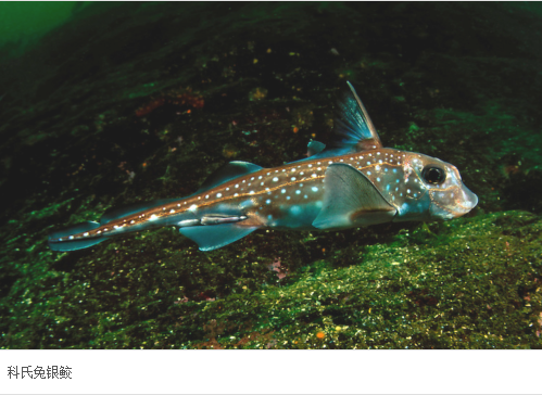 科氏兔银鲛(学名:Hydrolagus colliei)是银鲛科、兔银鲛属鱼类。幼鱼出生时全长14厘米。一般成年体长为36厘米,最大达60厘米。头似兔子,头大,鸭嘴形鼻子宽,眼睛绿。牙齿相对较少。下颚有一对牙齿,而上颚有两对牙齿。身体朝着鱼的尾端逐渐变细。尾巴几乎占整条鱼总长的一半。皮肤光滑,没有鳞片,有明显的侧线管。在第一背鳍的前缘有一个突出的毒刺,它比鳍本身略高,而第二背鳍有一个起伏的轮廓,使它看起来像两个独立的鳍。发育良好的胸鳍呈三角形,基部肉质。雄性头部有一个多刺的棒状突起。它们还具有在腹鳍前面的尖锐的回缩扣合器官,细长扣合器端部靠近每个腹鳍基部,具有扩展的末端。身体是棕色或灰色的,有金色、绿色和蓝色。身体上散布着白色斑点,导致该鱼呈现出虹彩和银色光泽。该鱼的腹面为银色,鳍为灰色。