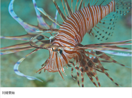 斑鳍蓑鲉(学名:Pterois volitans)是鲉科,蓑鲉属硬骨鱼。体长25-40厘米,体表黄色,布有红色至棕色条纹。背部有毒棘,胸鳍羽状,背鳍、臀鳍和尾鳍透明。两眼上方有数根触须。吻长而狭,背面中央凸起。眼中等大,眼间隔狭而凹入。口端位,上颌中央有一凹刻。鳃盖骨具一扁棘;鳃孔宽大。体被圆鳞或栉鳞。
