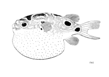 双斑鲀,Tetraodon biocellatus (Tirant, 1885),。8字娃娃顾名思义,因其背上的金色线条酷似一个“8”字而得名。8字娃娃和潜水艇鱼(即绿河豚)一样,属于小型的观赏河豚。该鱼常见于东南亚地区的河流入海口处,属于汽水鱼。幼鱼在淡水中生存,成鱼则在海水中生存。产地:柬埔寨、印度尼西亚、马来西亚、泰国、越南