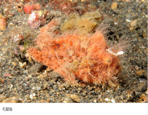 毛躄鱼(学名:Antennarius hispidus)是躄鱼科、躄鱼属的一种鱼类。一般体长在100毫米以内,最大个体可达148毫米,为蹙鱼属中个体较大者。体粗短,侧扁,长卵圆形。尾柄宽短,尾柄长稍小于尾柄高。头较高大,头高和头长几相等。额部在第二、第三背鳍棘间有一凹窝区,皮肤表面光滑。吻较短,大于眼径。眼较小。鼻孔每侧2个。口大,上位。鳃孔小,圆形,鳃耙退化。体无鳞片,但皮肤粗杂。胸鳍前方沿体侧至头腹面具稀疏的皮须状突起。背鳍2个。臀鳍与第二背鳍相对,起点在第二背鳍后部下方,鳍条均分支。胸鳍位于体侧下方,假臂状构造发达。腹鳍喉位,较小,最后一鳍条为分支鳍条,其余均不分支,腹鳍在头腹面常作水平状向两侧伸展。尾鳍圆形,均为分支鳍条。鲜活标本淡黄色或黄褐色,有许多深色带纹。液浸标本淡褐色,腹部无色,各鳍及头体上均具不规则形的黑褐色斜带或斑纹,眼周围有5-6条黑色条纹排列呈放射状。吻触手末端的拟饵体黑色。