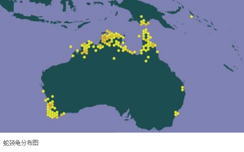 蛇颈龟分布于澳大利亚、印度尼西亚、巴布亚新几内亚及托雷斯海峡部分岛屿。