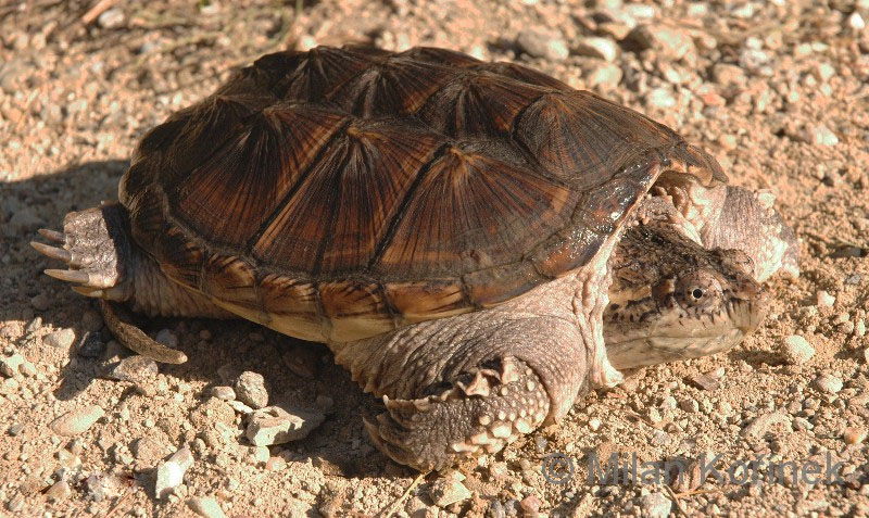 Chelydra serpentina)是鳄龟科、拟鳄龟属动物。体呈扁椭圆形或近似圆形,背部较为平坦,一般成年个体背甲长50厘米左右。外形较为奇特,头部粗大,略呈三角形,头部腹面呈浅棕色或浅灰色。颈脖短而粗壮,表面有多列纵向排列的肉质疣粒突起。吻较长,上颌端带钩,口裂较大。眼睛较小。背甲呈圆形或近圆形,背部边缘整齐,呈黑褐色、黄褐色、浅褐色或棕灰色。腹部呈浅白色、淡黄色或微棕色,腹甲较薄占整个腹部的比例较小。四肢粗壮,背面布生角质鳞片,善于爬行;蹼丰满肥厚,趾、指间长有锐利的爪,前肢5只、后肢4只。尾巴粗长,尾背前边2/3处有一条鳞皮状隆起棱背,棱背上有呈半月状突起的肉刺,呈锯齿口状排列,酷似鳄鱼的尾巴,因而得名“鳄鱼龟”。与其他龟类不同的是,鳄龟的头部、四肢、尾巴不能缩入甲中。
