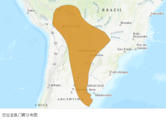 巴拉圭凯门鳄在南美洲分布比较广,在阿根廷、玻利维亚、巴西和巴拉圭都有分布。