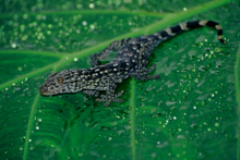 巨蜥 Varanus salvator是一种巨型蜥蜴,一般全长1米,大者达2.5米以上。吻狭长,舌前端深分叉,可缩入舌鞘内。有活动的眼睑,瞳孔圆形。四肢壮实,指趾具锐爪。尾长而侧扁。背鳞颗粒状,具棱;腹鳞长方形,呈有规则的横行排列。成年巨蜥背面黑色,部分鳞片有淡黄色斑;幼年巨蜥具黑白相间的大环纹。尾部黑黄两色交替成环纹,黑色环上常有小黄斑。