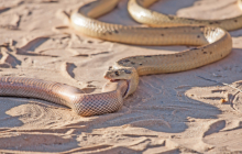 比如非洲西南部纳米比亚的沙地,十分炎热,但这里的侧翼响尾蛇却能适应。它将头部抬起,身体前半部分离开地面,然后开始单侧斜行,利用上背部重复运动。若从玻璃下方观察其行进,能看到它的身体连续性地猛烈推挤,这也说明其尽可能不让身体与灼热的沙地接触,任何时候都一样。如此绝妙本领,让其行动面积加大,甚至可以爬上高达300米的沙丘。