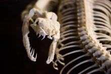 蛇的颅骨属于双颞窝类,但在蜥蜴类退化方轭骨的基础上,又进一步失去眶后骨和轭骨,也无围眶小骨,从而完全消失了眼窝、上颞窝、下颞窝三者之间分界的骨弧,使之汇合成一个大孔。方骨的活动性因上述诸骨消失而得到了加强,并通过与鳞骨、翼骨、腭骨、横骨等骨之间的可动性关节,以及凭借韧带联接的左、右下颌。脊柱分区不明显,仅分化为尾前椎和尾椎两部分。椎骨前凹型,除前、后关节突外,尚有由相邻两枚椎骨的椎弓凹和椎弓突共同合成的关节,可增强前、后椎骨的联系和灵活性,以利脊柱的活动。无胸骨,也不构成胸廓。除寰椎外,所有尾前椎的两侧都附接肋骨,肋骨的腹端和中段分别以肋皮肌与其紧贴的前、后腹鳞相连。