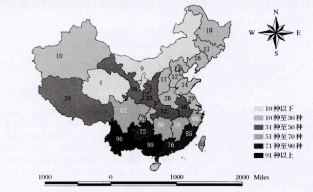 中国:蛇广泛分布于中国全境,但主要分布于长江以南的东洋界,表现出由北到南物种数量逐渐增多的分布趋势和特点。其中以福建省、云南省和广西壮族自治区分布的种类最多(85-100余种),其次为广东、贵州、湖南、四川、海南、安徽和浙江等省(60-76种);而古北界种类较少(≤30种 ),其中青海、新疆、内蒙古和黑龙江省最少(4-10种)