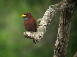 蓝喉三宝鸟资料不详,体型大小似阔嘴三宝鸟,两性相似,喙黄色,头部与背部称亮红铜色,喉部蓝色非常显眼,颈部与胸部与背部相同呈红铜色,尾部呈蓝色,腿黑色。