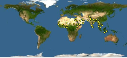 分布于孟加拉国、贝宁、不丹、布基纳法索、柬埔寨、喀麦隆、中非共和国、乍得、科特迪瓦、埃及、厄立特里亚、埃塞俄比亚、冈比亚、印度、伊朗伊斯兰共和国、伊拉克、以色列、约旦、老挝人民民主共和国、马里、毛里塔尼亚、缅甸、尼泊尔、尼日尔、尼日利亚、阿曼、巴基斯坦、巴勒斯坦、沙特阿拉伯、塞内加尔、南苏丹、斯里兰卡、苏丹、泰国、乌干达、阿拉伯联合酋长国、越南、也门、中国(云南西南部、中部和南部)。