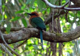阔嘴翠鴗是中小型攀禽。喙长、宽而微下弯,喙缘有锯齿。朝前的两个趾基部部分愈合。尾长,中央尾羽特长,在近末端处有一段仅余羽干,致使端部形成独立的小羽片,形成球拍状,为其显著特征。翅短圆;体羽多为辉亮的绿、蓝及褐色;雌雄异色。以昆虫、蠕虫、蜥蜴、各种无脊椎动物及小型脊椎动物为食,有时也吃果实。栖息在开放的环境,如森林边缘及丛林。在水边崖岸凿穴或在沙滩用下弯的嘴挖洞为巢,产3~4枚白色卵,两性孵化及育雏。在等候猎物时,可长时间地平息不动,一旦发现猎物,就突然猛扑过去。在栖木上尾常左右摆动或斜着。