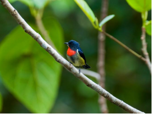 形态特征:身材娇小,喙短小而尖。背部毛呈青色,尾羽为黑褐色。胸前有一撮红色的毛,故称红胸皇鸠。