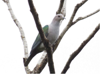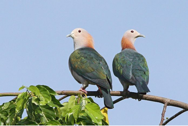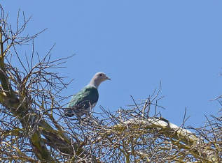 生活习性:绿皇鸠常单个或成对活动,冬天也成群活动。常在树冠层活动,特别是早晨和黄昏,常栖于大树顶端的枯枝上,一般很少下地,通常仅在需要啄食泥上和沙粒时才下地。飞行快速而有力,多在高空中,但拍翼并不频繁。叫声为“咕,咕,咕,……”,比较深沉,即使在附近鸣叫,听起来也好像是从远处传来的声音,终止前的一声比较延长,声音也很特别,很象是人类窃笑的声音。