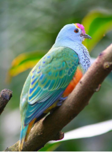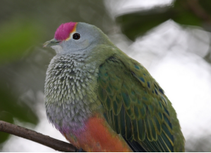 粉顶果鸠(学名:Ptilinopus regina):共有5个亚种,体长20-24厘米,体重85-125克。是一种非常漂亮的小型鸽类。拥有粉红的头顶、绿色的翅膀、灰色的胸膛与橙黄色的腹部。胸部浅灰色至绿色,有斑点。在胸部中央有明显和广泛的粉紫色斑点。胸部的橙色渐融合了腹部和尾下的黄色。尾巴覆羽绿色。鸟喙和腿爪灰绿色。