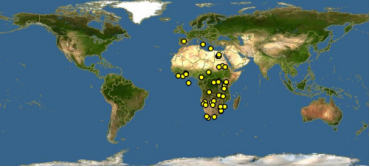 分布范围:原产地:安哥拉、贝宁、博茨瓦纳、布基纳法索、喀麦隆、中非共和国、乍得、刚果、刚果民主共和国、科特迪瓦、赤道几内亚、厄立特里亚、埃塞俄比亚、加蓬、加纳、几内亚、几内亚比绍、肯尼亚、利比里亚、马拉维、马里、莫桑比克、纳米比亚、尼日尔、尼日利亚、卢旺达、塞内加尔、塞拉利昂、索马里、南非、南苏丹、坦桑尼亚联合共和国、多哥、乌干达、赞比亚、津巴布韦。
