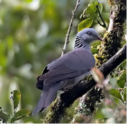 中等体型(35厘米)的灰色鸽。特征为后枕具宽阔的皮黄色而带黑色鳞状斑的颈环。上背呈淡紫色及绿色闪光。头部灰色较上体浅;胸灰,渐变为灰白色的臀;颏白。虹膜-白色至黄色;嘴-灰绿,基部紫色;脚-红色。叫声为深沉叫声hu…hu…hu。