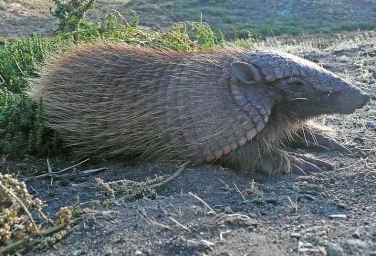 长毛犰狳(学名:Chaetophractus vellerosus)上体两侧和4肢外侧常覆盖着骨板与鳞板,并由几列可动的横带分成前后两部,横带间由弹性皮肤连接,可将身体蜷缩成球状,以防御天敌侵害;身体和四肢下部,所有的铠甲鳞片都覆盖着白色或浅棕色的毛发。耳小;舌能伸缩;前肢3指,指爪弯曲强大,后肢5趾,具爪;牙齿细小,钉状,终生生长。分布于美洲。