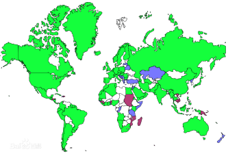 未定分布:安圭拉岛、贝宁、柬埔寨、开曼群岛、圣诞岛、科摩罗、多米尼加共和国、萨尔瓦多、赤道几内亚、格林纳达、几内亚、洪都拉斯、牙买加、马达加斯加、密克罗尼西亚、莫桑比克、诺福克岛、帕劳、巴布亚新几内亚、圣多美和普林西比、塞舌尔、苏丹、台湾、东帝汶、图瓦卢、越南、瓦利斯和富图纳群岛。