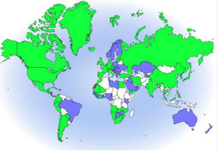 不确定:安圭拉、巴哈马、多米尼加、多明尼加共和国、赤道几内亚、瓜德罗普岛、马提尼克岛、尼加拉瓜、巴拿马、波多黎各、圣多美和普林西比、特克斯和凯科斯群岛、英属维尔京群岛、撒哈拉沙漠西部。