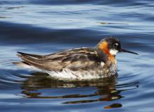 灰瓣蹼鹬(学名:Phalaropus fulicarius)是瓣蹼鹬科瓣蹼鹬属鸟类。小型水鸟,体长20-24厘米。嘴短而粗,繁殖期黄色,尖端黑色,脚褐色,趾具黄色瓣蹼。嘴基至头顶黑色,眼周和眼后有连成一体的大块白斑,在暗色的头上极为醒目。背黑褐色,羽缘淡色。肩部有棕栗色纵带,翅上有白色带斑;腰两侧白色,飞翔时极明显。下体栗红色。雄鸟头顶缀有皮黄白色,羽色显得较淡,下体两侧和腹微缀白色,头侧白斑较大。冬羽上体淡灰色,头和下体白色,自眼后有一黑带经过眼到眼前,头顶后部亦有一黑斑,在白色的头上极为醒目。嘴黑色。