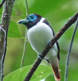 肉垂阔嘴鸟颜色鲜艳,因其制作的鸟巢大且复杂而闻名。这种鸟最显著的特征是围绕其眼睛四周的天蓝色垂肉(wattle)。