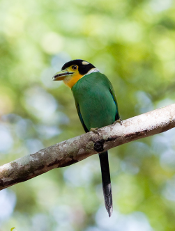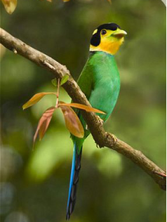 外形特征:泰国长尾阔嘴鸟体长为20—28厘米,体重47—79克。雄鸟和雌鸟的羽色相似,都比较艳丽,虹膜褐色或红褐色;嘴黄绿色;跗跖和脚趾橄榄绿色。嘴形宽阔而平扁。头部及耳语为亮黑色,顶部中央有一个亮蓝色斑块,稍沾紫色或淡黄白色,闪耀宝石光泽;后枕两侧各具一块鲜黄斑。前额基线至眼先,喉部及颈侧均为亮黄色。两翅基部亮钻蓝色,形成显著的翼镜,余部暗蓝色和绿色,近基部具白色翼斑。上体为亮草绿色;下体淡绿色,多少渲染淡蓝色。尾羽表面亮蓝色。雌鸟的羽色与雄鸟相似。