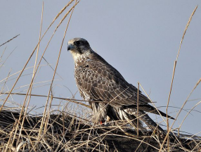 物种特征:矛隼东北亚种(学名:Falco rusticolus obsoletus)是隼类中体型最大的一种,嘴、脚强健并具利钩,适应于抓捕及撕食猎物。喙基具蜡膜;翅强而有力,善疾飞及翱翔。索腭型头骨。脚和趾强健有力,通常3趾向前,1趾向后,呈不等趾型。头骨宽阔,上眼眶骨扩大,眼球较大,视野宽阔,视觉敏锐;听觉发达。多以小型至中型脊椎动物为主食,特别是鼠类及病弱动物,食量大,食物中不消化的残余,如骨、羽、毛等物,常形成小团块吐出,称为“食丸”。