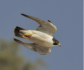 游隼(学名:Falco peregrinus):是中型猛禽,共有18个亚种。体长41-50厘米。翅长而尖,眼周黄色,颊有一粗著的垂直向下的黑色髭纹,头至后颈灰黑色,其余上体蓝灰色,尾具数条黑色横带。下体白色,上胸有黑色细斑点,下胸至尾下覆羽密被黑色横斑。飞翔时翼下和尾下白色,密布白色横带,常在鼓翼飞翔时穿插着滑翔,也常在空中翱翔,野外容易识别。幼鸟上体暗褐色,下体淡黄褐色,胸、腹具黑褐色纵纹。