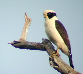 笑隼著名的捕蛇鸟类,中等体型,体长约46cm,体重570g。头部有一条环绕着眼周、脸颊和枕部的黑色羽带,鸣叫声似人笑声。