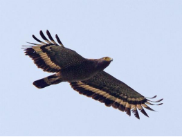 形态特征:蛇雕琉球群岛亚种是蛇雕的亚种之一。中型猛禽,体长55-73cm。上体暗褐色或灰褐色,具窄的白色羽缘。头顶黑色,具显著的黑色扇形冠羽,其上被有白色横斑,尾上覆羽具白色尖端,尾黑色,中间具一宽阔的灰白色横带和窄的白色端斑。喉、胸灰褐色或黑色,具暗色虫蠹状斑,其余下体皮黄色或棕褐色,具白色细斑点。飞翔时,从下面看,通体暗褐色,翼下具宽阔的白色横带和细小的白色斑点,尾下亦具宽阔的白色横带和窄的白色尖端,极为醒目,站立时尾常左右摆动。幼鸟和成鸟大体相似,但体色较淡,头顶白色,尖端黑色,下体白色,胸具暗色条纹。
