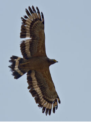 形态特征:蛇雕马来半岛亚种是蛇雕的亚种之一。中型猛禽,体长55-73cm。上体暗褐色或灰褐色,具窄的白色羽缘。头顶黑色,具显著的黑色扇形冠羽,其上被有白色横斑,尾上覆羽具白色尖端,尾黑色,中间具一宽阔的灰白色横带和窄的白色端斑。喉、胸灰褐色或黑色,具暗色虫蠹状斑,其余下体皮黄色或棕褐色,具白色细斑点。飞翔时,从下面看,通体暗褐色,翼下具宽阔的白色横带和细小的白色斑点,尾下亦具宽阔的白色横带和窄的白色尖端,极为醒目,站立时尾常左右摆动。幼鸟和成鸟大体相似,但体色较淡,头顶白色,尖端黑色,下体白色,胸具暗色条纹。