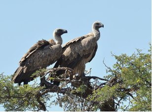 南非兀鹫(学名:Gyps coprotheres):体长110厘米,身高达115厘米,翼展228-255厘米;体重9.4千克。寿命30年。南非兀鹫的体羽为奶油色,与其翅膀上黑色的飞行羽和尾羽及黑色的鸟喙形成鲜明的对比。成鸟有蜜色的眼睛和赤裸的蓝色喉咙。当这些巨大的清道夫在空中飞行时,可以看到苍白的,几乎银色的侧翼羽毛。