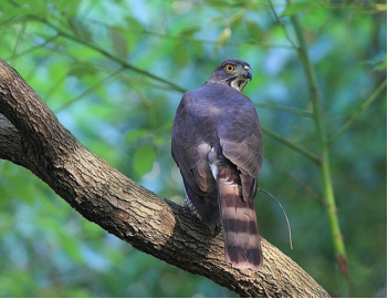 凤头鹰(学名:Accipiter trivirgatus)属中型猛禽,体长41-49厘米。头前额至后颈鼠灰色,具显著的与头同色冠羽,其余上体褐色,尾具4道宽阔的暗色横斑。喉白色,具显著的黑色中央纹;胸棕褐色,具白色纵纹,其余下体白色,具窄的棕褐色横斑;尾下覆羽白色;飞翔时翅短圆,后缘突出,翼下飞羽具数条宽阔的黑色横带。幼鸟上体褐色,下体白色或皮黄白色,具黑色纵纹。