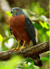双齿鹰(学名:Harpagus bidentatus):为鹰科齿鹰亚科的鸟类,是一种小型猛禽,体长约35厘米,上体羽毛深蓝色,下体胸腹部的羽毛棕红色,腿爪黄色有黑爪尖,眼睛棕红色。