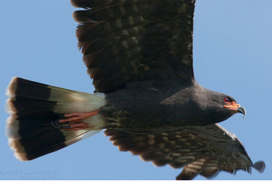 外形特征:蜗鸢墨西哥亚种是一种中型猛禽,体长45厘米,翼展120厘米,体重360-520克,寿命17年。成年雄性的整个头部,背部,翅膀,胸部,腹部,侧腹和大腿形成一个整体的深石板灰色,展开的羽毛和尾巴羽毛几乎是黑色。上体覆盖有少许棕灰色的色彩。尾巴底面和尾部根基是白色。虹膜深红色,有的亚种有白眼眉,眼睛的黄亮色在各时期不同。蜡质,口角的色彩也不尽相同。雌性头顶和脖子大多是灰色的羽毛,头颈部两侧是黑色,腹部的羽毛,中间有一个红色覆盖的边界,尾巴下类似雄性,虹膜橙色,脸部有裸露的皮肤。