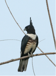 外形描述:体型略小(32厘米)的黑白色鹃隼。黑色的长冠羽常直立头上。整体体羽黑色,胸具白色宽纹,翼具白斑,腹部具深栗色横纹。两翼短圆,飞行时可见黑色衬,翼灰而端黑。飞行时振翼如鸦,滑翔时两翼平直。
