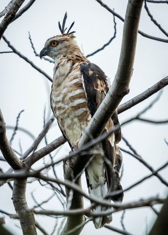 形态特征:褐冠鹃隼为中型猛禽。头顶红褐色而具有黑色的纵条纹。头顶有由2-3枚羽毛构成的长黑色羽冠,常常垂直地竖立于头上,尖端为白色,特点非常鲜明。眼先、头侧灰色。上体为褐色,喉部为白色,中央还具有黑色纵纹,其余下体棕褐色,具有宽阔的白色和红褐色横斑。飞羽上具有宽阔的暗灰色和黑色横带。尾羽为灰褐色,具有2-3道宽阔的暗色横斑和宽的暗色亚端斑,飞翔时极为明显。